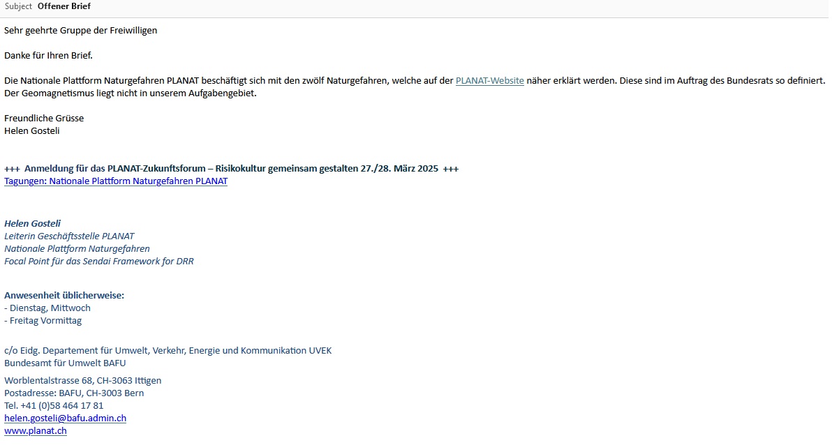 | Nationale Alarmzentrale und Ereignisbewältigung NEOC Herr Gerald Scharding Guisanplatz 1B CH-3003 Bern E-Mail: info@naz.ch |